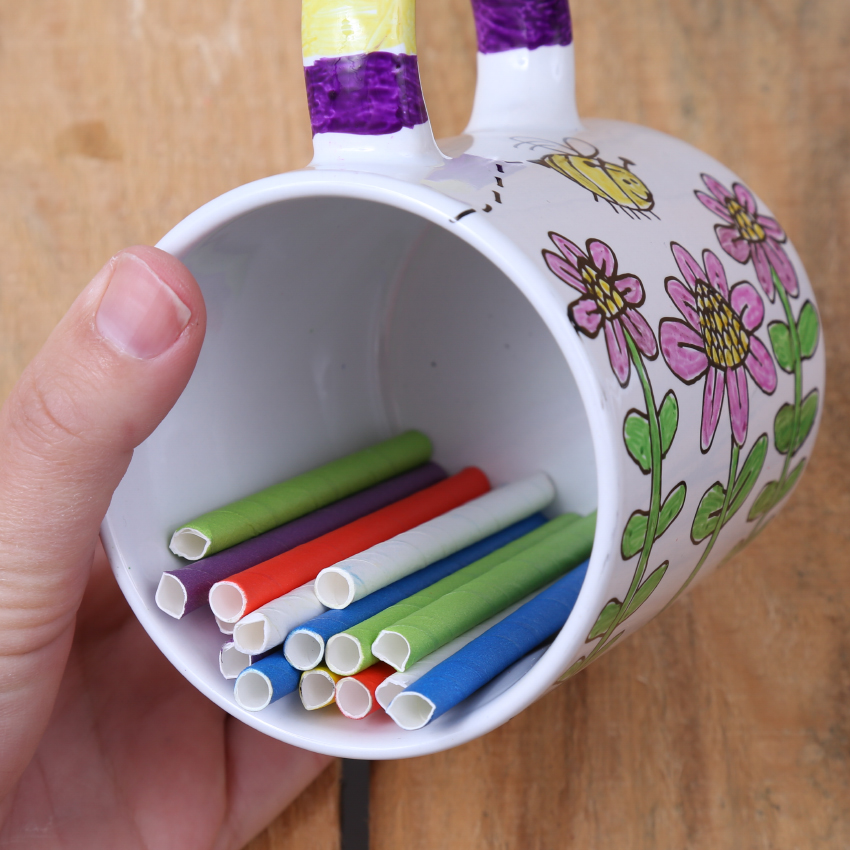 • Step 6Continue to fill the mug until it is completely full. Remember to squeeze them in nice and tight so they don’t fall out.