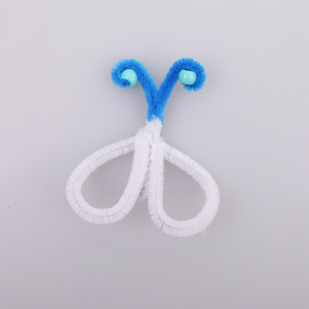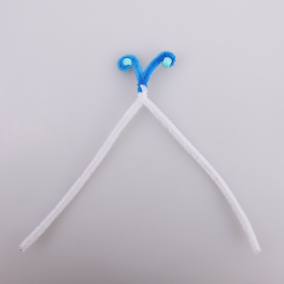 • Step 6Bend a white chenille stem into a ‘v’ shape. Overlap this bend with the bend of your antennae and twist both chenille stems together to secure them.