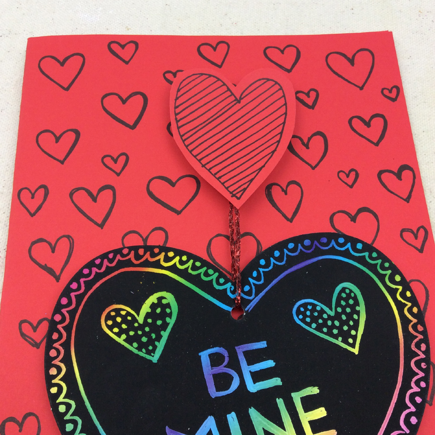 • Step 4String a length of yarn through the hole in the scratch board heart, making it long enough to sit nicely on the card when attached with a glue dot to the top construction foam square.