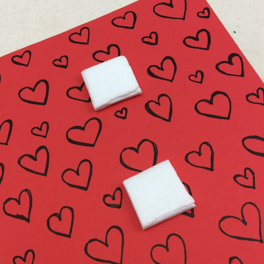 • Step 3Cut 2 small squares of construction foam and use glue dots to attach to the front of the card. One will sit near the top, middle of the card while the other will be closer to the bottom middle. These will act as props to raise the scratch board heart off the background of the card.