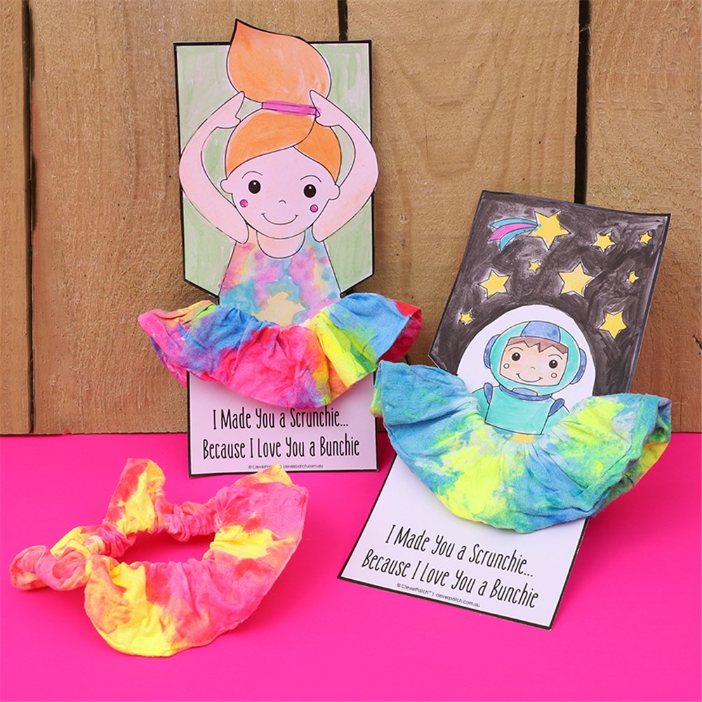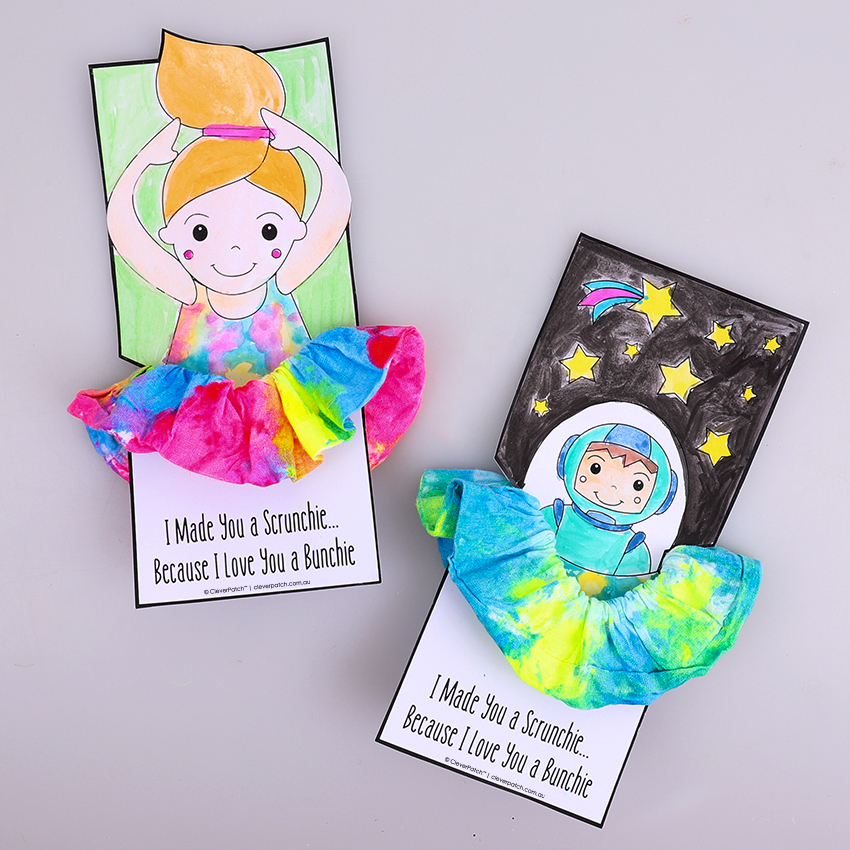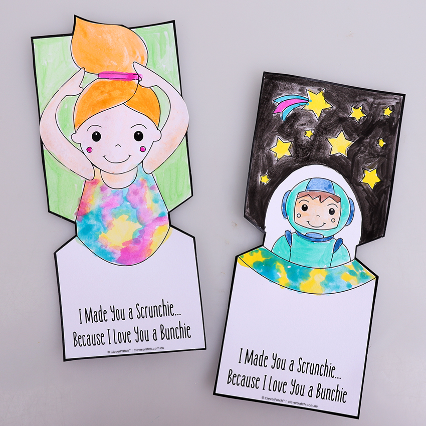 • Step 6Download and print the template provided. We recommend printing onto cardboard as this will make a sturdy card for your scrunchies. Decorate your chosen template design with your favourite materials and allow to dry if needed. Carefully cut out around the thick template outline. Adult supervision is recommended when using scissors.