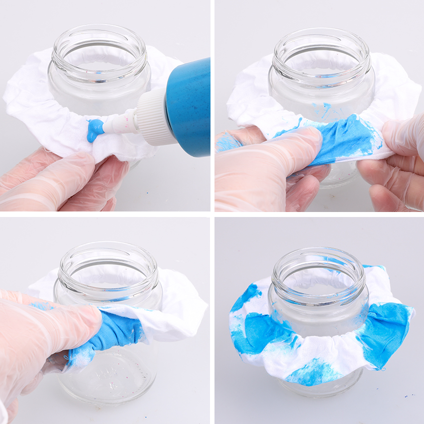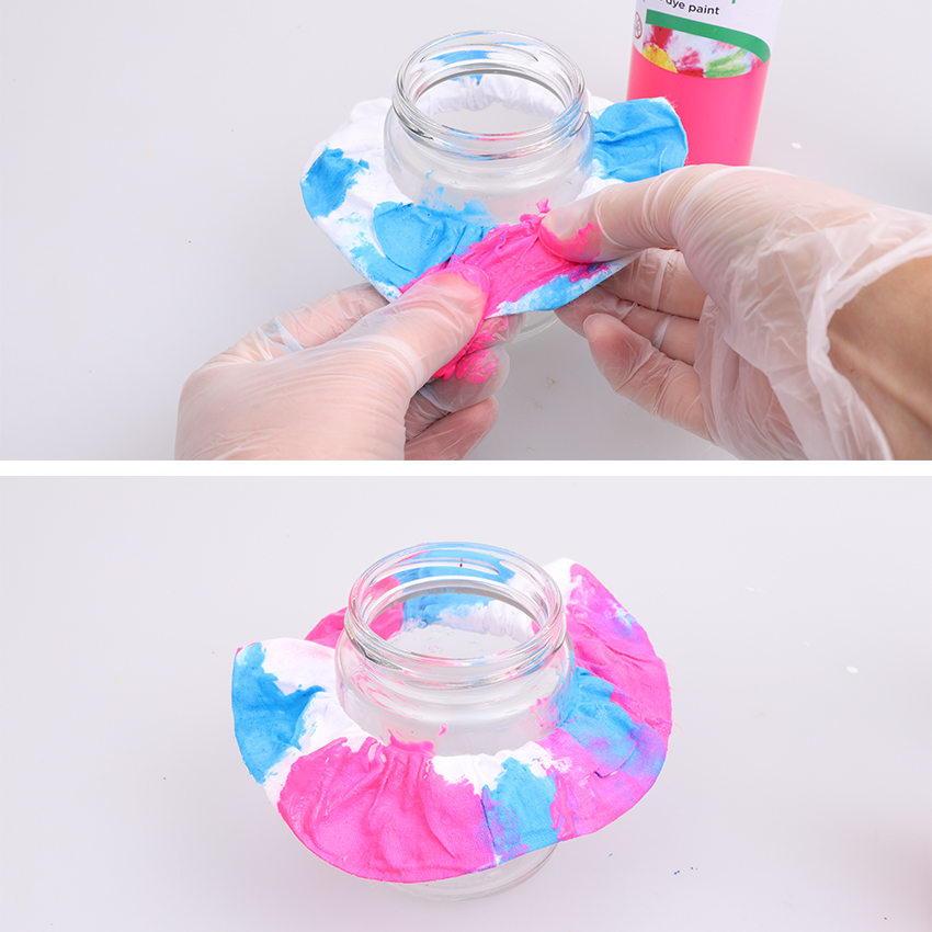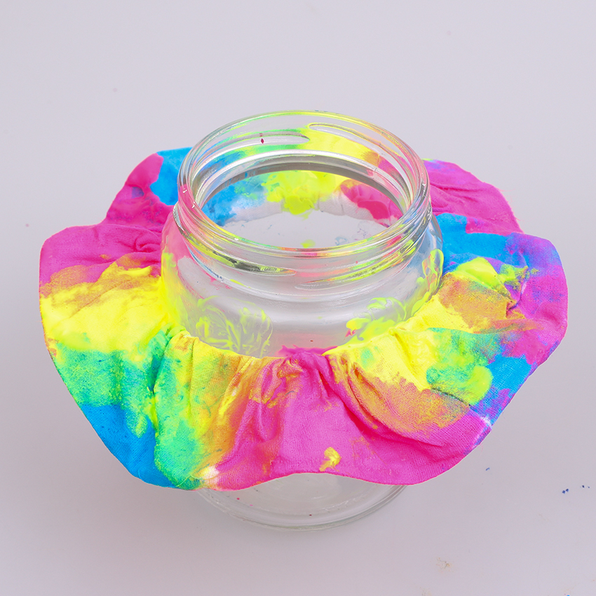 • Step 4Repeat step 3 for as many colours as your design needs until you reach your final colour. Clean and dry your gloves then add patches of the final colour until the scrunchie is completely covered. Leave the scrunchie on the jar and allow it to air dry completely.