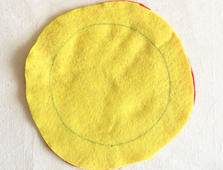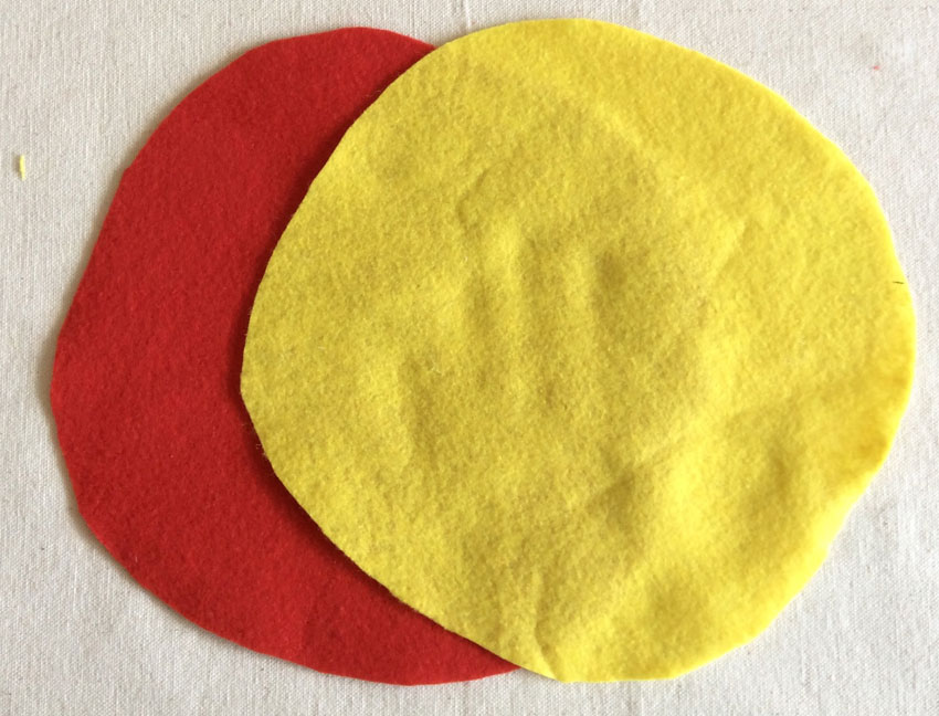 • Step 1 Cut out two circles of felt in different colours. We chose red and yellow for ours. Make sure they are approximately the same size.