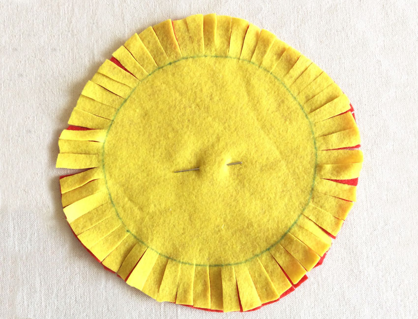 • Step 2 Layer them together and then draw another circle approximately 3cm smaller onto your top felt circle. Cut strips from the outer edge of your felt to the inner circle edge. Repeat all the way around your felt. You may need to pin your circles together so they don't move around while you are cutting.