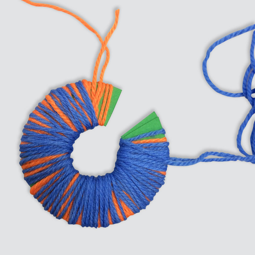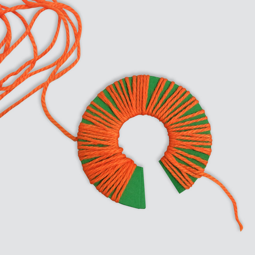 • Step 2Place 1 template on top of the other. Cut 6m of orange Soft Yarn Wool and wrap around the templates.