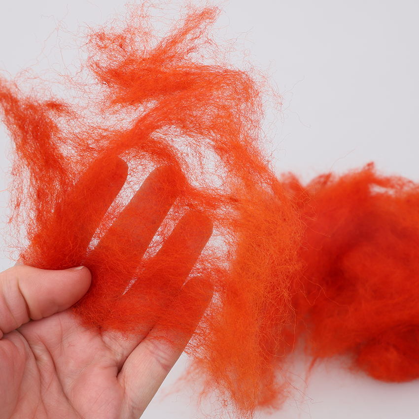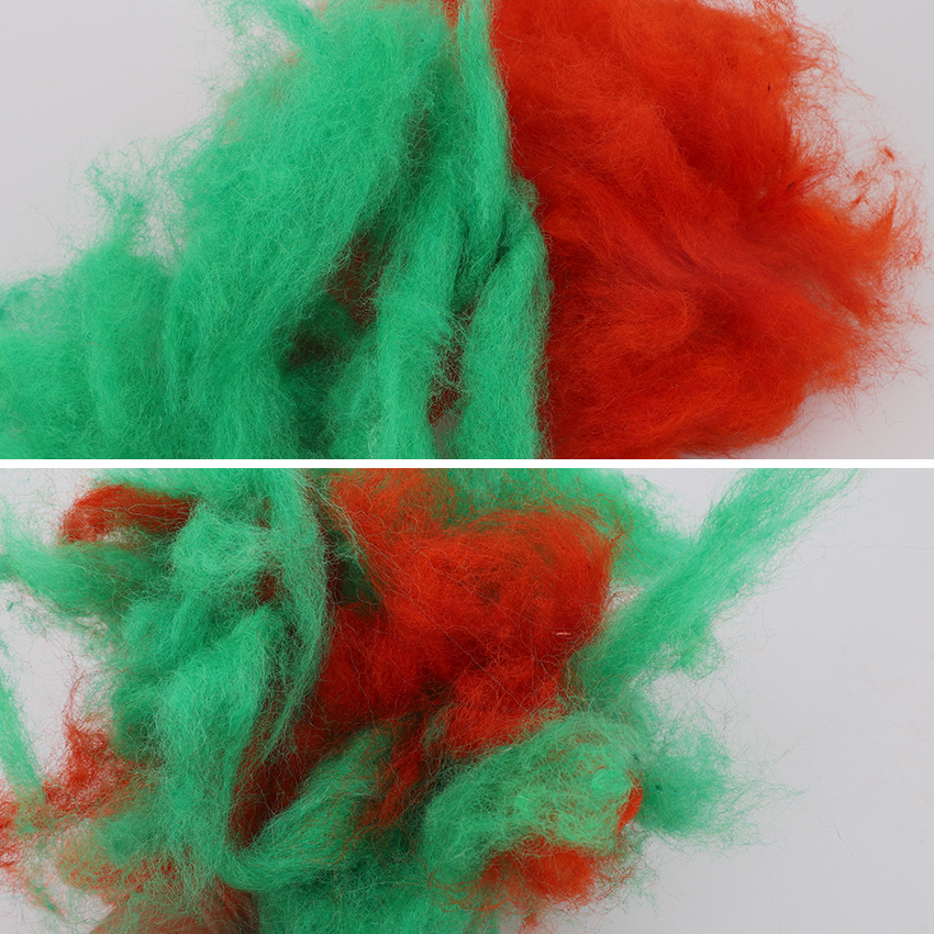 • Step 2Repeat with the green wool so you have a pile of each colour. Grab both colours of the wool and begin to mix and pull the fibres between your hands until the colours are mixed.