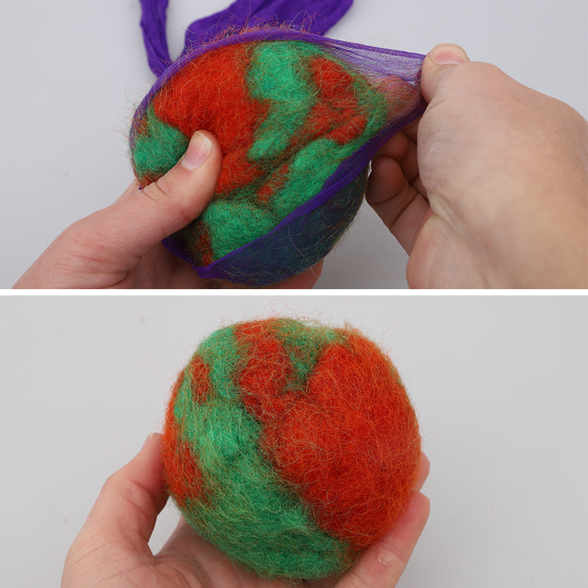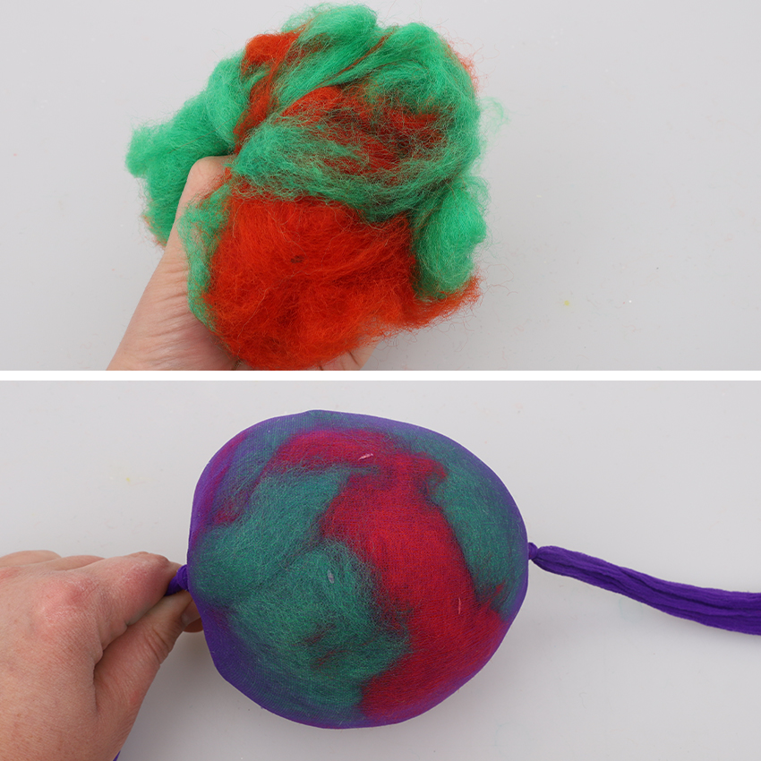 • Step 3Shape the wool into a ball then push it inside a stocking piece. Mould the wool into a sphere and tying a knot in the stocking on either side of the ball to hold it in place. You can add more balls along the stocking piece if you wish, tying knots between them as you go.