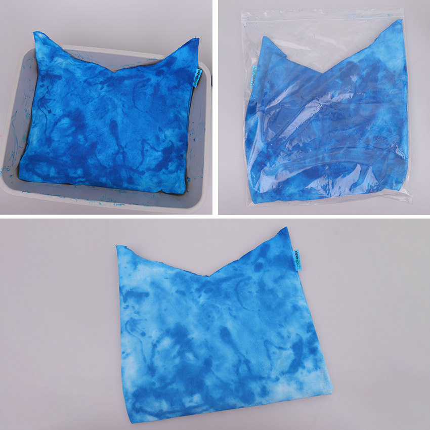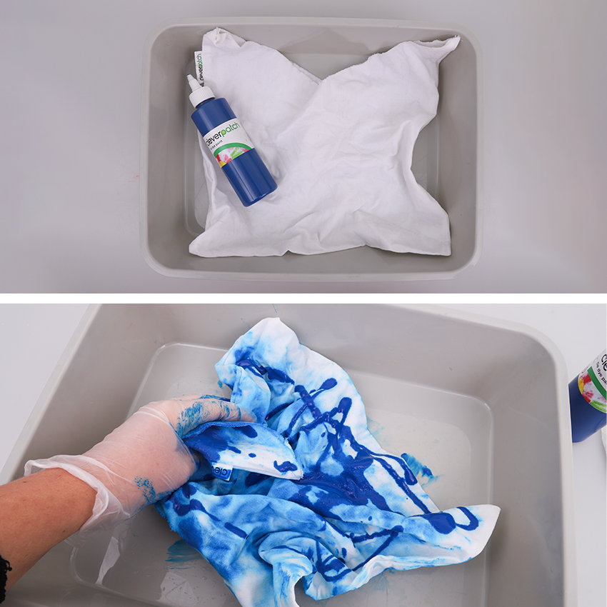 • Step 3Wet the bag and squeeze out any excess water. Using gloves and a splash mat or tray to contain the mess, add blue tie dye paint to the wet bag. Scrunch and massage the paint into the fabric.