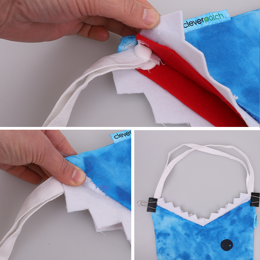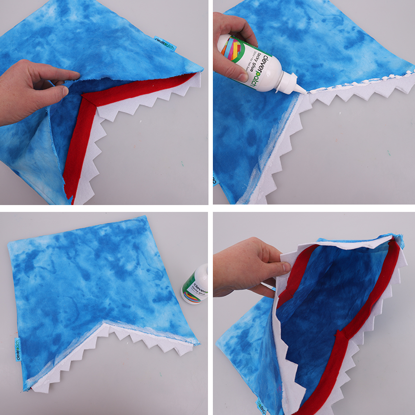 • Step 6Place the teeth and gums in position inside the bag and trim any overlapping pieces if necessary. Add tacky glue to the inside rim of the bag on one side and stick two of the teeth/gum sets in place as shown. Make sure the red felt is on the inside of the bag. Flip the bag over so you can see the outside of the bag and add tacky glue where the bag edge meets the teeth. Spread out using a glue brush and allow to dry. Repeat on the opposite side of the bag to complete the shark’s mouth.