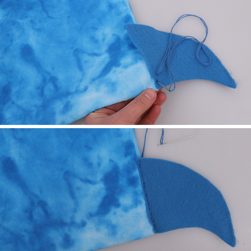• Step 7Use a needle and 1m of embroidery thread to sew the fin onto the edge of bag at the base as shown. Click here to learn how to sew a back stitch. Tie a knot and cut away any excess thread.