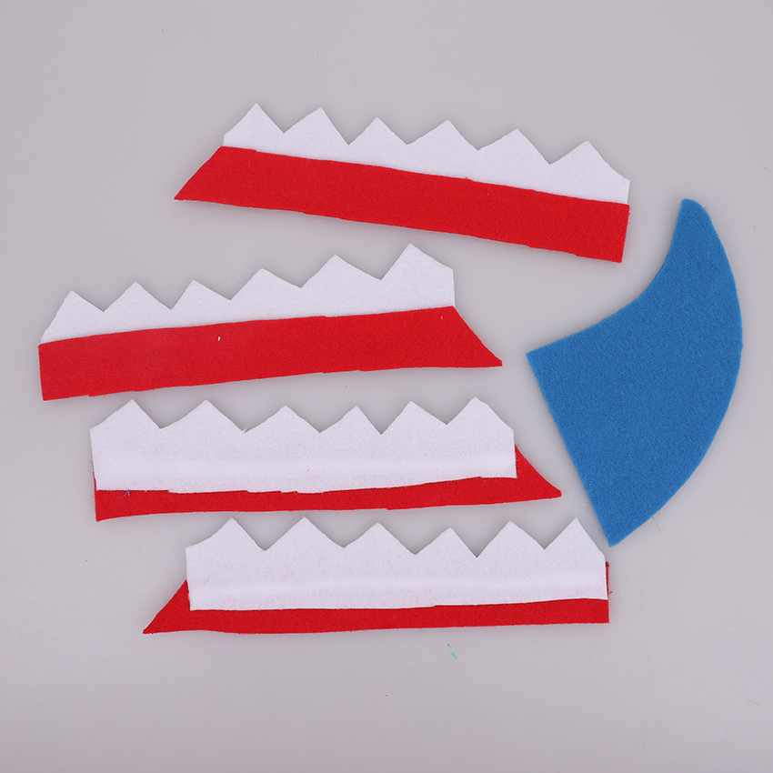 • Step 5Use the templates provided to cut out four teeth from white felt, four gums from red felt and one fin from blue felt. Use tacky glue to stick the teeth onto the gums as shown. Allow to dry.