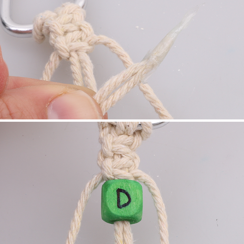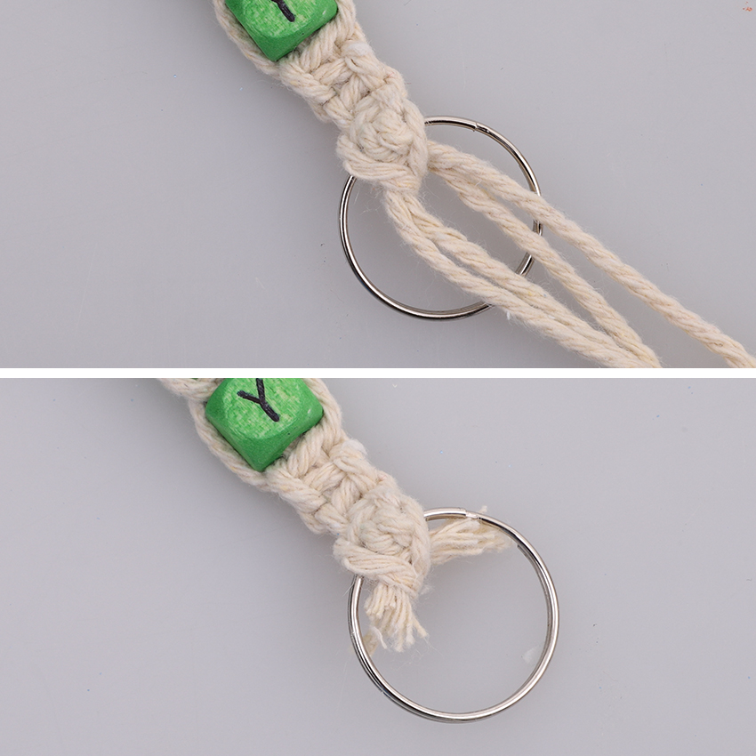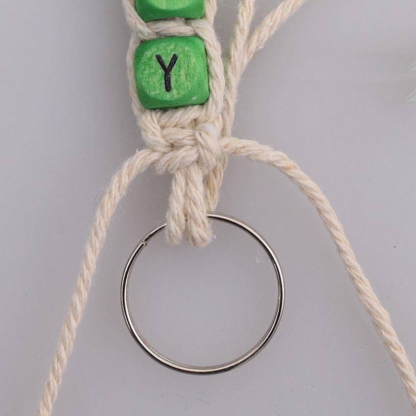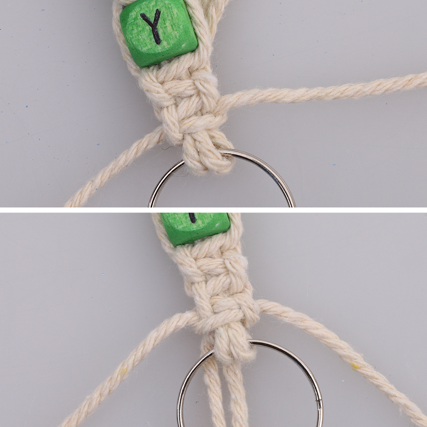 • Step 10Tie the first half of a half square knot, making sure it’s around all the folded middle cords. Fold the middle two cords back down and through the centre of the split ring. Finish the square knot, making sure it’s around the folded middle cords, holding them in place.