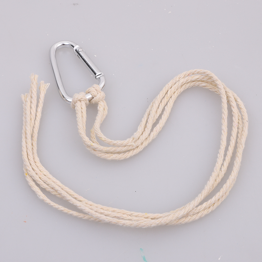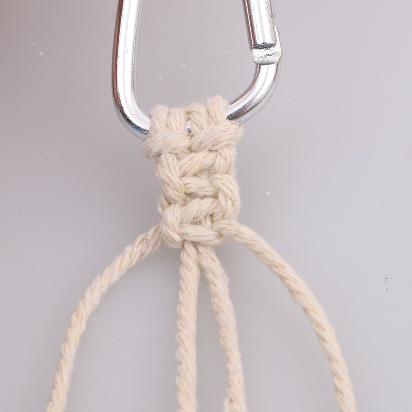 • Step 3Cut two lengths of macramé cord, each measuring 1m long. Adult supervision is recommended when using scissors. This length should give you plenty of cord to work with, however you may need to adjust for longer messages. Attach each length of cord to the carabiner clip using a cow hitch knot.