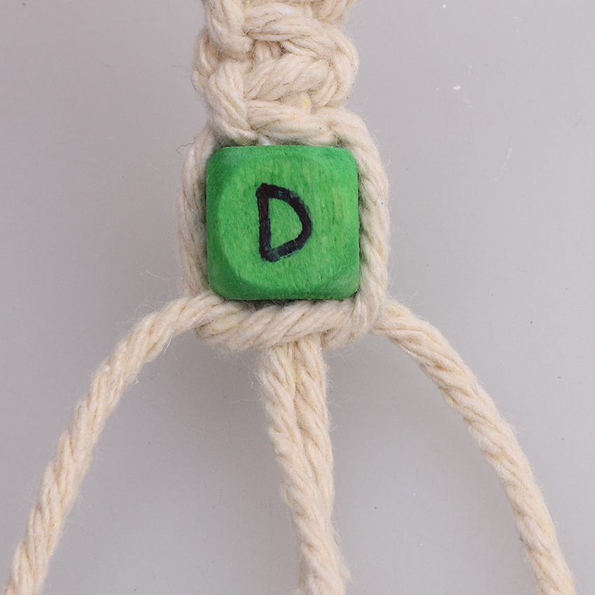 • Step 7Add the second bead of your message. Push it up under the half square knot and tie another half square knot below, this time starting with the opposite side you used in Step 6. Continue threading on beads and tying alternate half square knots until your whole message has been added and there is a half square knot under the final bead.