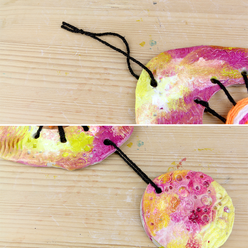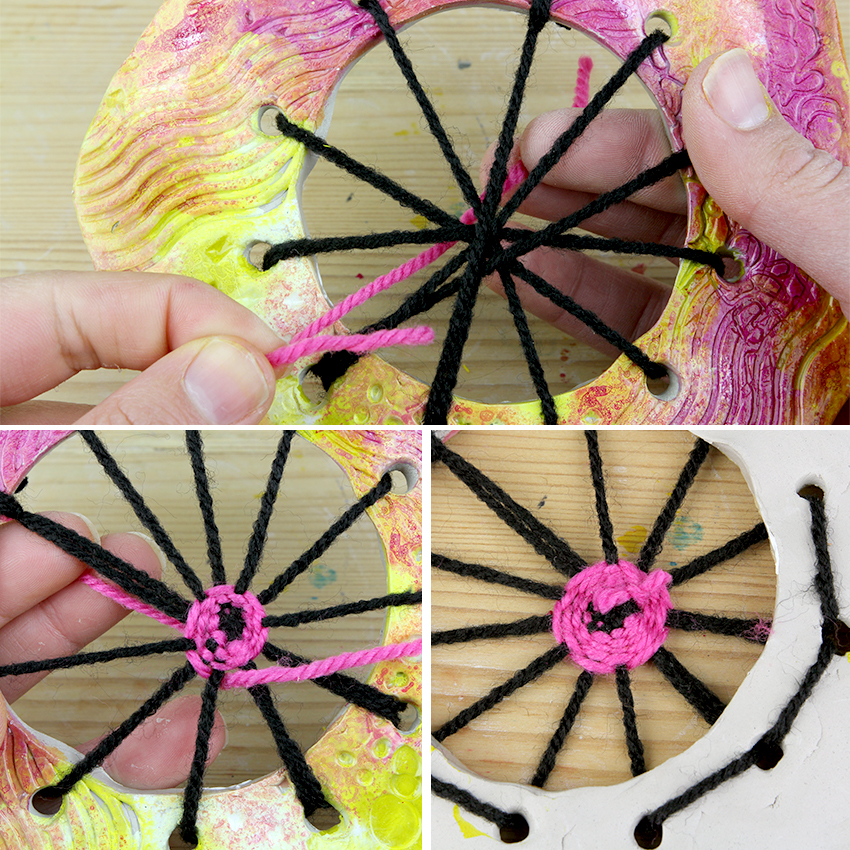 • Step 8Cut a 2m length of soft yarn wool. Adult supervision is recommended when using scissors. Starting with the top hole around the centre of your clay frame, thread the yarn through the hole leaving at least a 5cm ‘tail’ of yarn at the back. Pull the yarn across the circle, down to the bottom hole directly opposite the top hole. Thread the yarn down through this hole and then up through the hole directly to the left of this hole. Remember to keep hold of the ‘tail’ whilst doing this. Pull the yarn across the circle to the hole directly to the right of the top hole as shown and thread down through it. Continue in this way until you make it back to the original top hole, loop it through and tie off onto the tail from the beginning. You may need to double up on a couple of holes to make it back to the beginning. Trim any excess yarn.
