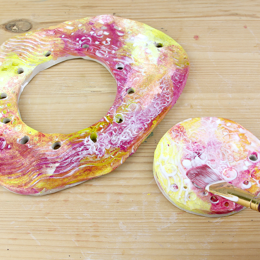 • Step 6Once the clay is dry, it’s time to add colour! Choose the colours of ink you want to use - we have chosen pink, yellow and white. Add some drops of the first colour to the clay frame and gently wipe and dab over the clay using a sponge. Continue adding the other colours until you are happy with the design. Allow to dry.