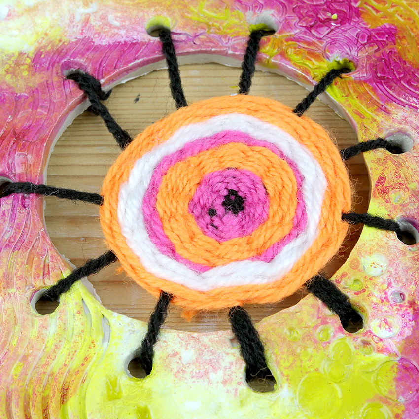• Step 10Continue weaving around the circle using different colours of yarn until you are happy with the design.