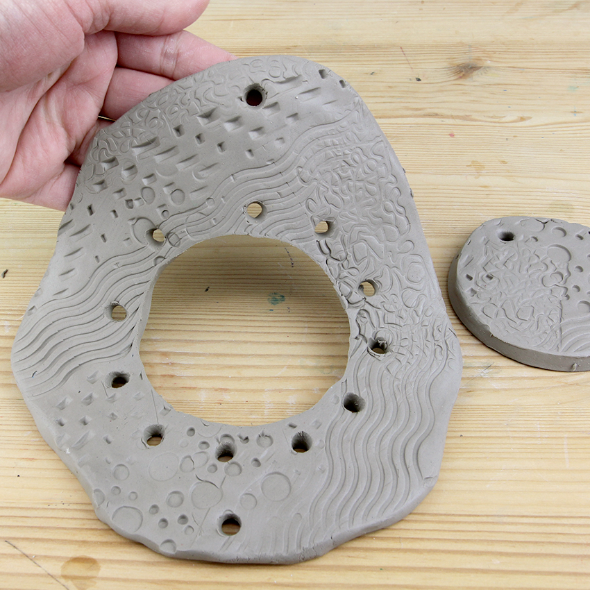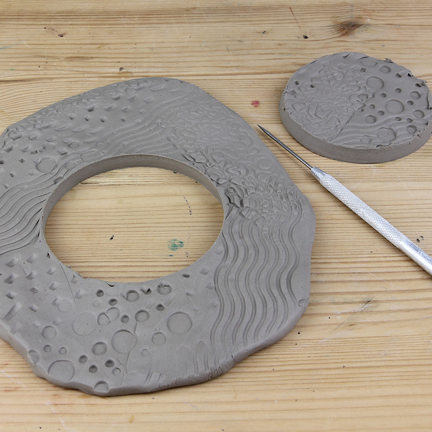 • Step 3Use the needle tool in the pottery kit to cut a circle from the centre of the slab as shown. Adult supervision is recommended when using a needle tool. Be sure to keep the circle cut out. You can use anything as a guide for this step - we used the inside of a roll of sticky tape. Just make sure the circle isn’t too big as we want to keep a nice thick border