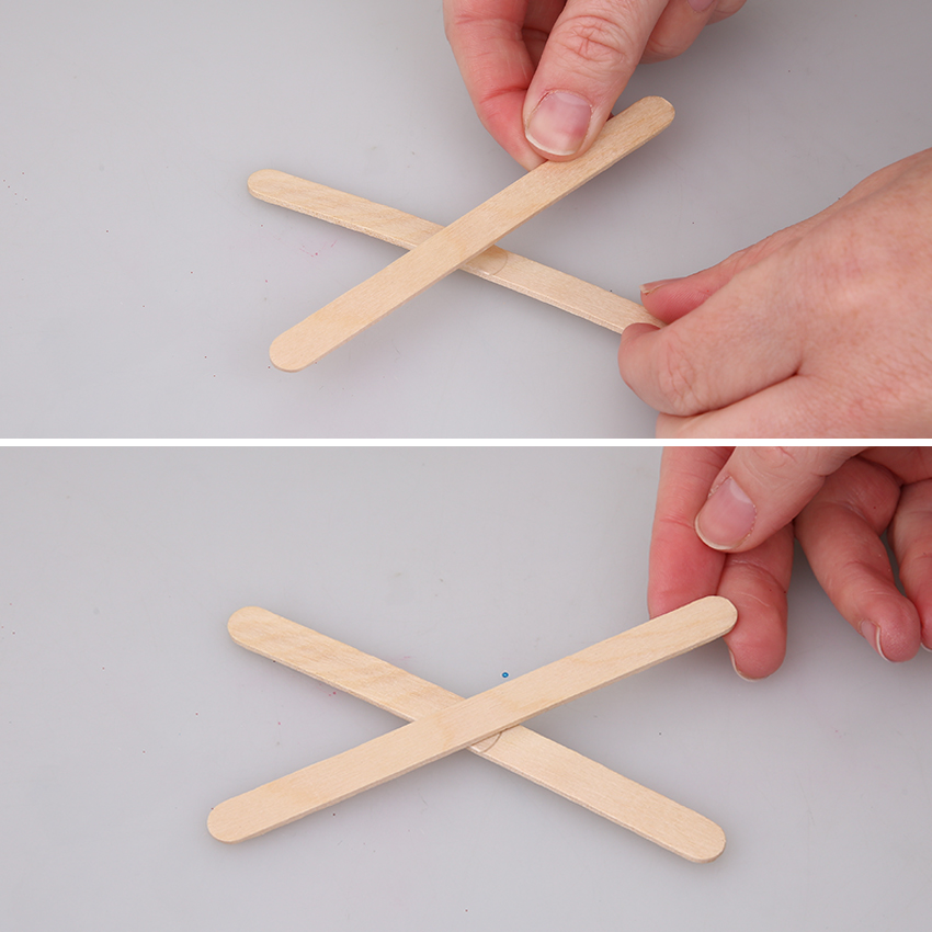 • Step 1Grab two popsticks and lay one on top of the other to create a cross. Use a glue dot in the middle of the cross to secure.