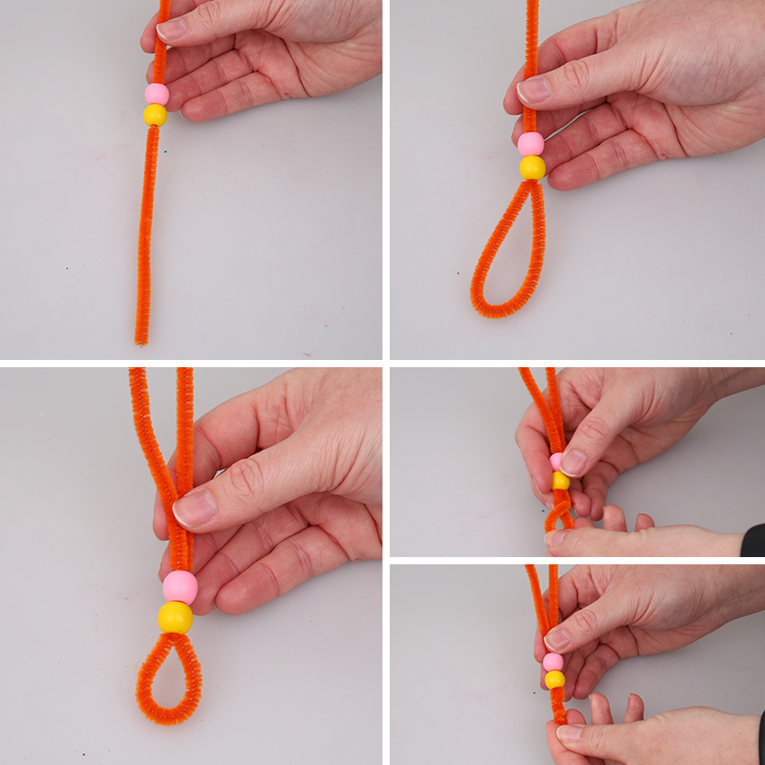 • Step 2Choose a coloured chenille stem for the body of your critter. Thread two beads on to one end of the chenille steam and push them into the middle. Thread the stem back through the beads so a small loop is hanging out at the bottom. Twist the bottom section of the stem to close the loop.