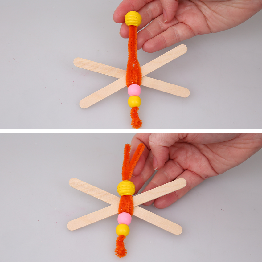 • Step 3Wrap each end of the chenille stem once around the middle of your popstick cross, so the ends are pointing up and away from the beads.