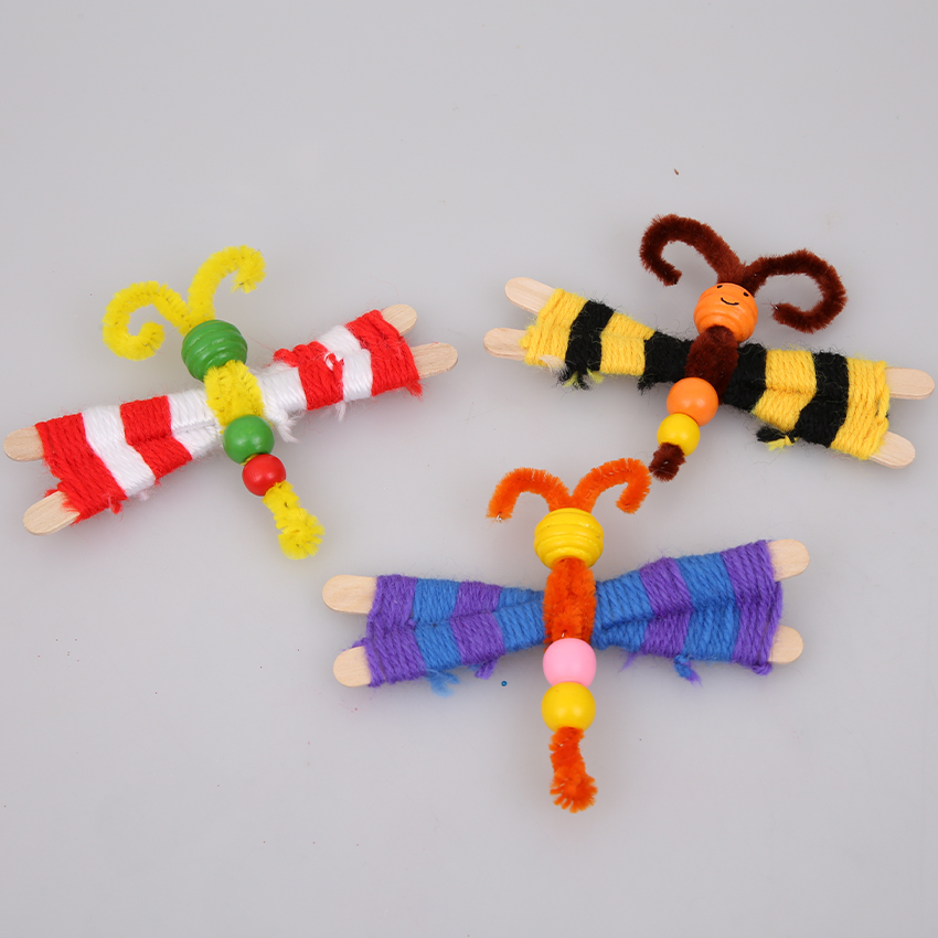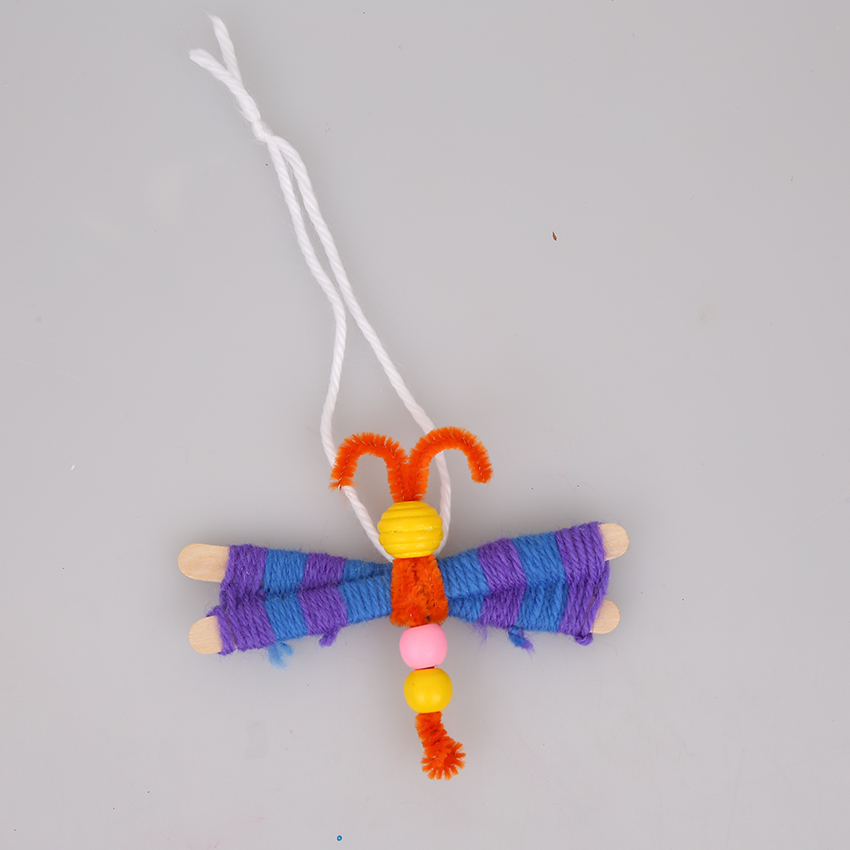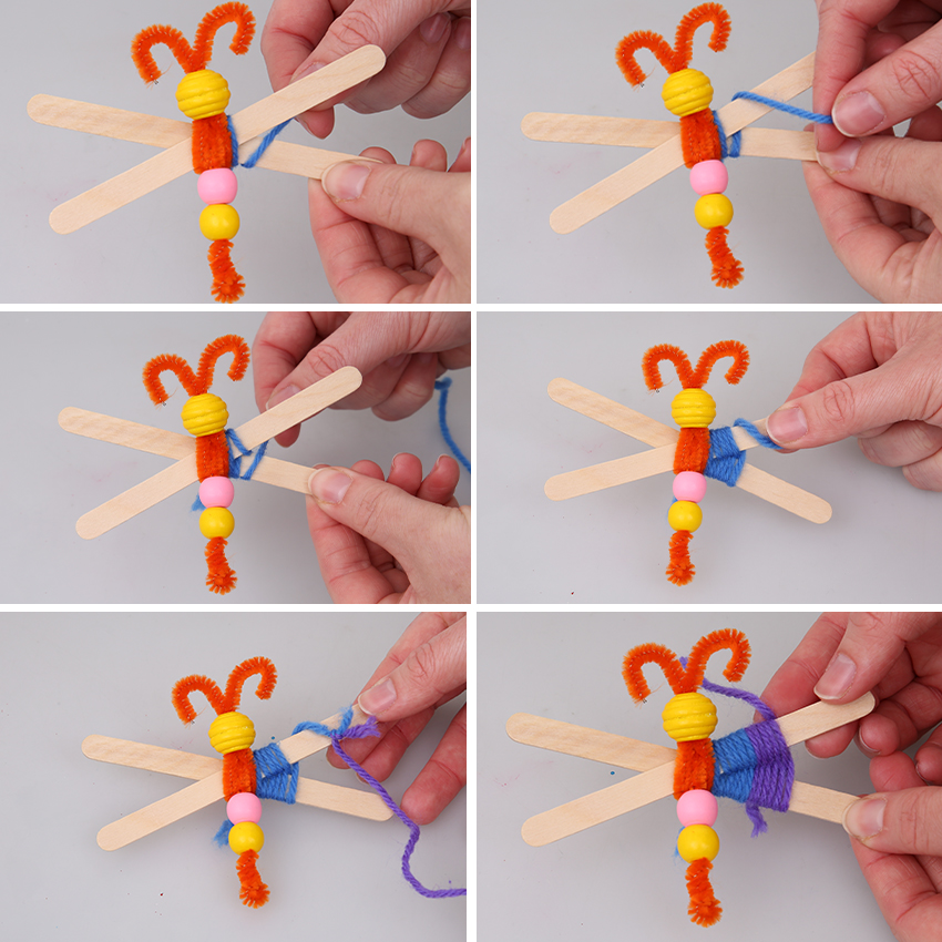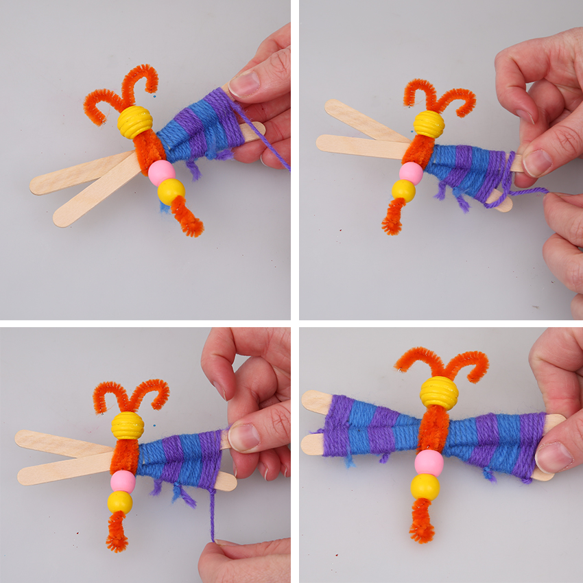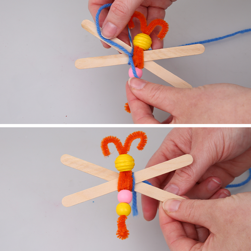 • Step 9Once you reach the end of the wing, tie the yarn with double knots to the end of each popstick and trim the excess. Repeat steps 7 to 9 for the other wing.