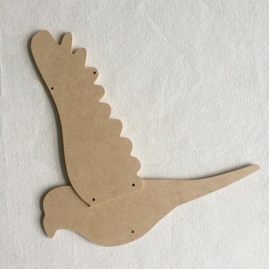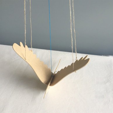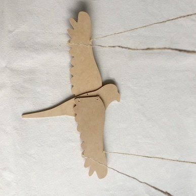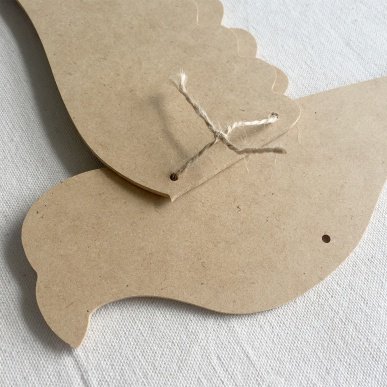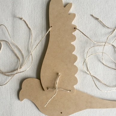 • Step 4With the wings still aligned you should see 2 holes that line up 2/3 of the way along the bird’s wings. Thread the 3.1m length of jute twine through the holes on the right side. Push the thread back through the holes on the left side. Tie a knot at the loose ends of the twine.