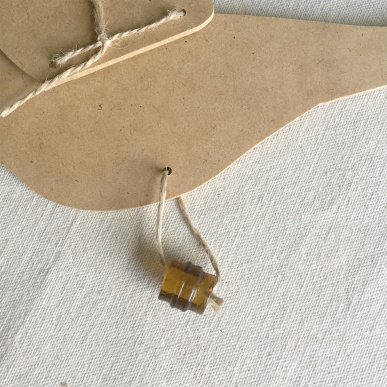 • Step 9To create a weight for your bird, thread your 15cm piece of jute twine through the hole on the bottom of your bird. Thread the bead onto this twine. Tie to secure.