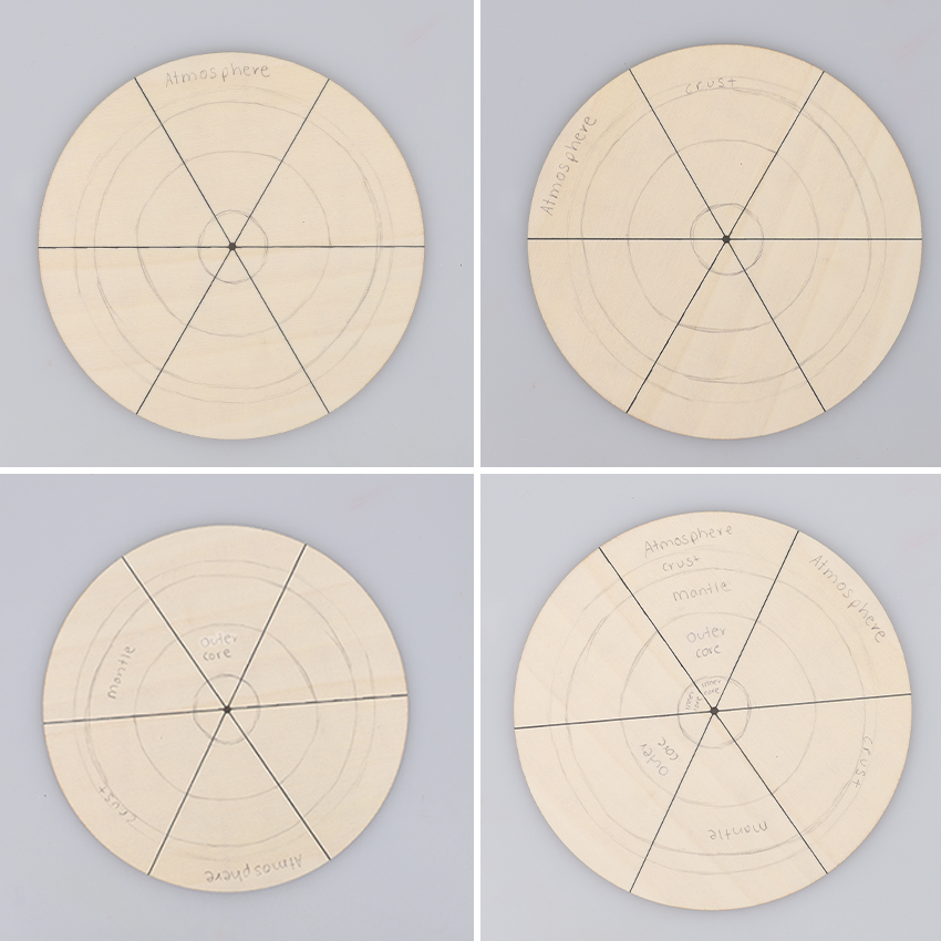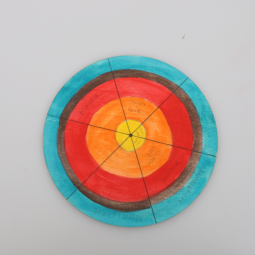 • Step 6Use the printed segments on the story wheel base to label a different layer in each segment, and label all layers in the final segment. This will mean you can unveil the layers as you spin your wheel! You will also need to make sure you label each layer in the following order: the outermost circle is the Atmosphere, then Crust, Mantle, Outer Core then Inner Core for the innermost layer. Ensure you write the labels around the wheel so they face towards the centre.