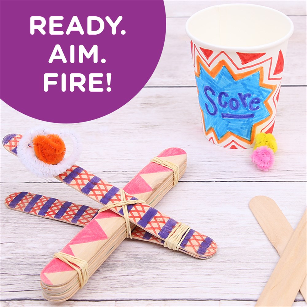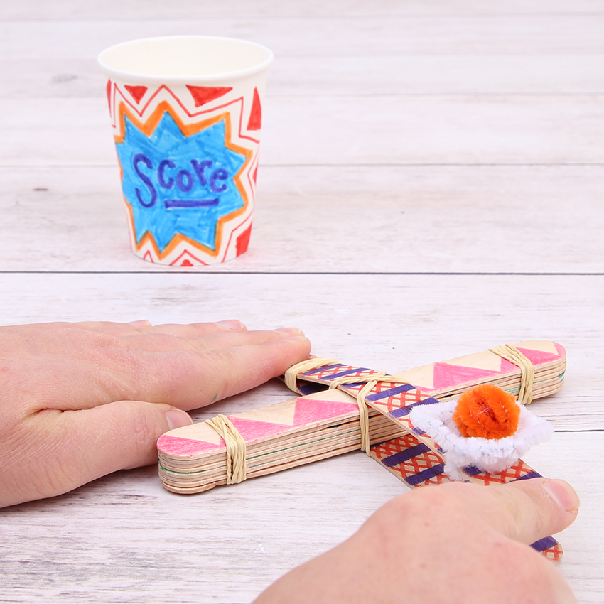 • Step 8Place a chenille stem ball into the basket of the catapult. Holding the base down with one hand, apply pressure to the raised end of the top popstick and release to launch! Experiment with angles and pressure to try and get the balls into the cup.