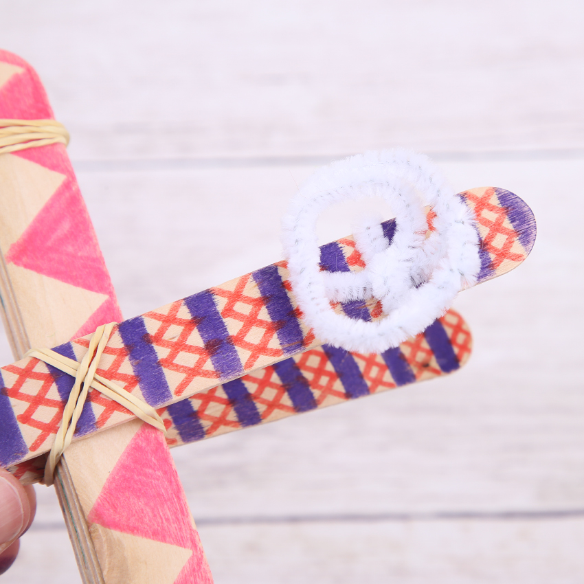 • Step 5Take a chenille stem and fold it in half. Place it so the middle fold is behind the end of the top popstick and then bring the ends up and around the top. Twist them together to hold it in place. Use the 2 long ends to then model a small, basket-like shape.