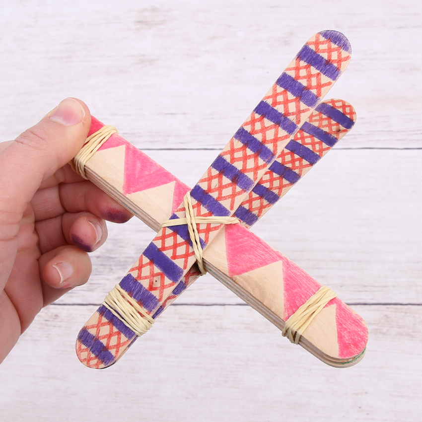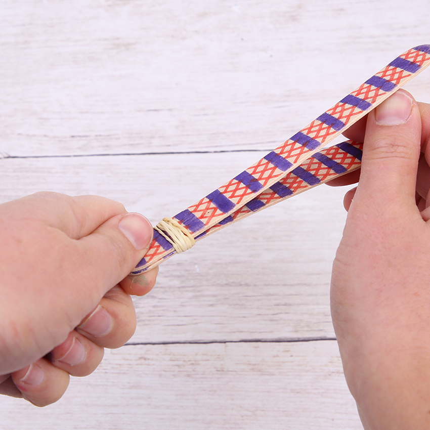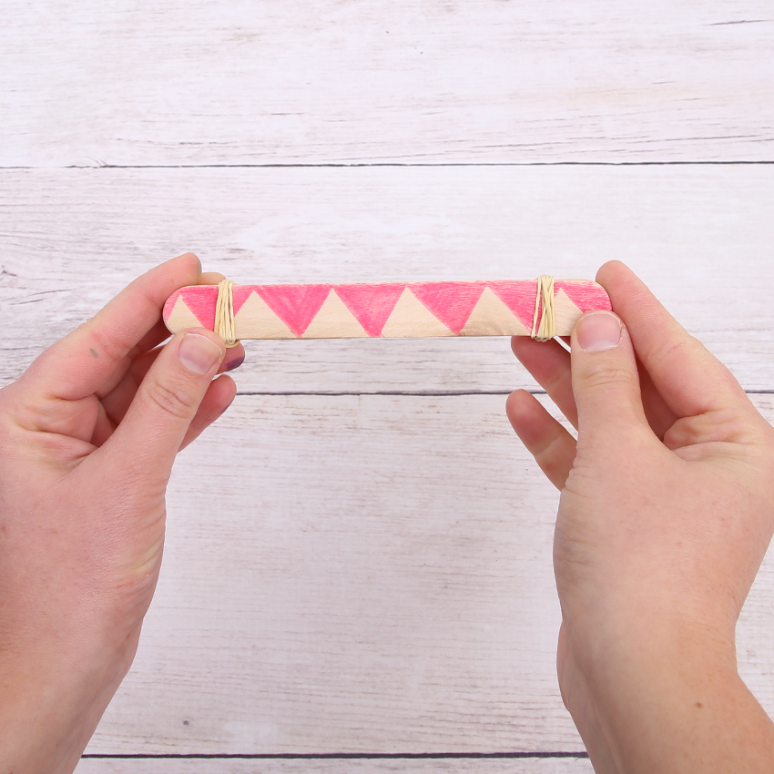 • Step 2Take 2 popsticks and use a rubber band to connect them together at one end.