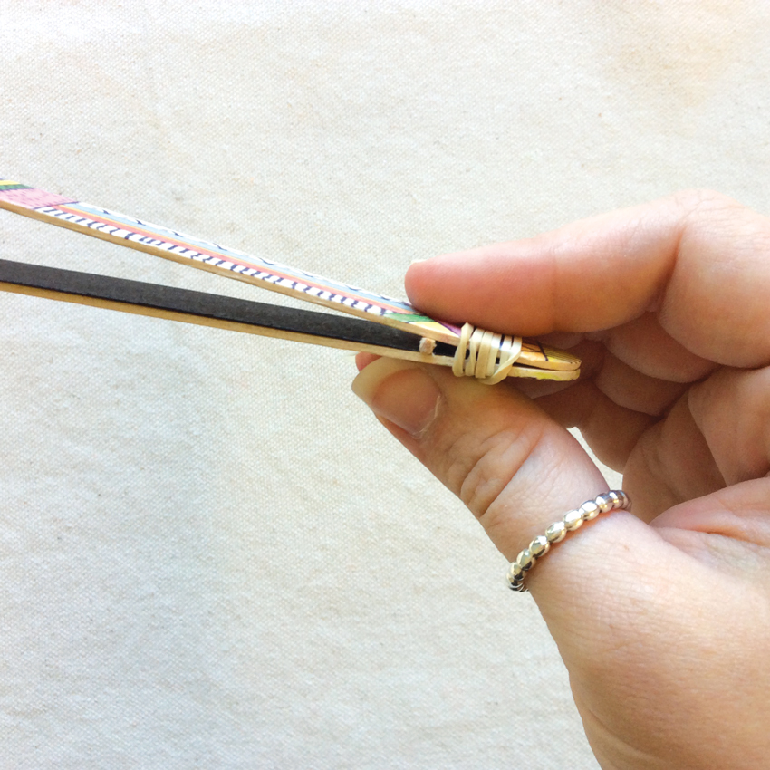 • Step 5Wrap the other end loosely with a rubber band then place in the other toothpick piece, this time under the cover paper. Tighten the rubber band.
