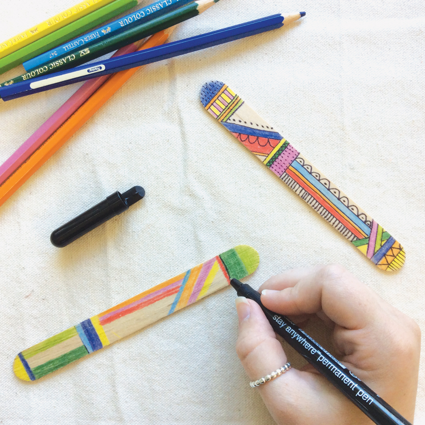 • Step 1Begin by decorating one side of two popsticks, as shown in the image above. You can colour in your popsticks or decorate them in a number of ways.