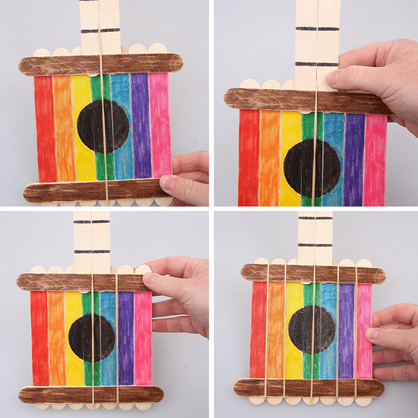 Construct your own ukulele using popsticks and rubber bands. Decorate with paper and coloured markers for a pop of colour!
