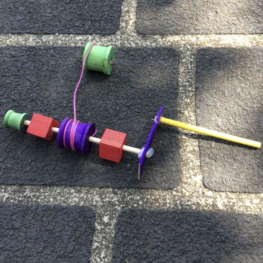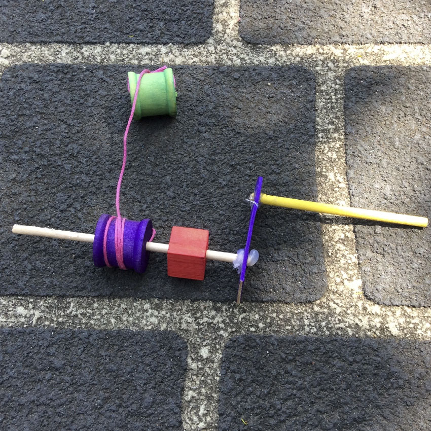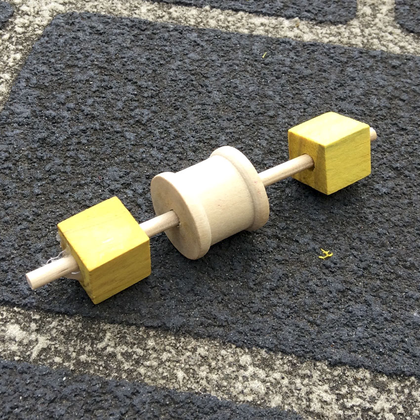 • Step 3 Onto one of the wooden sticks thread a wooden cube and then a spool. Attach the spool with glue and then wrap 40cm of string around it and then attach the end of the string to another spool with glue or a double knot.