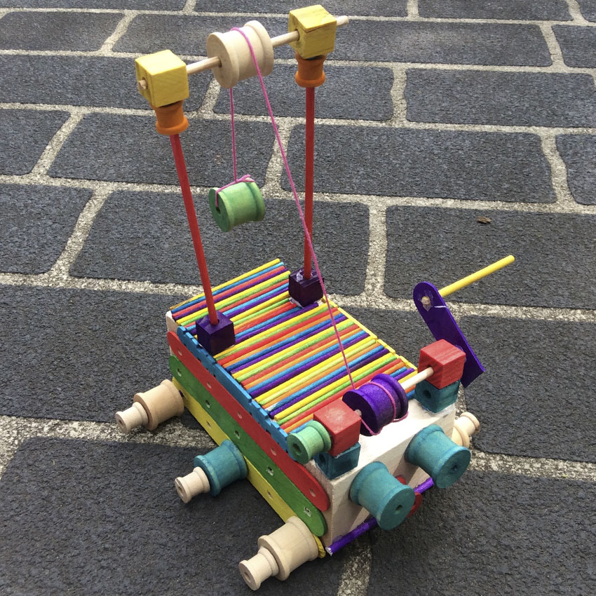 • Step 5 Place another 2 cubes under the first 2 cubes and attach with glue. Your pulley is complete! We then created a base structure for the pulley to sit on.