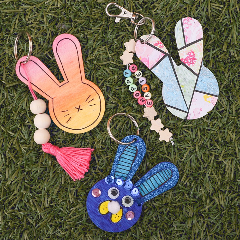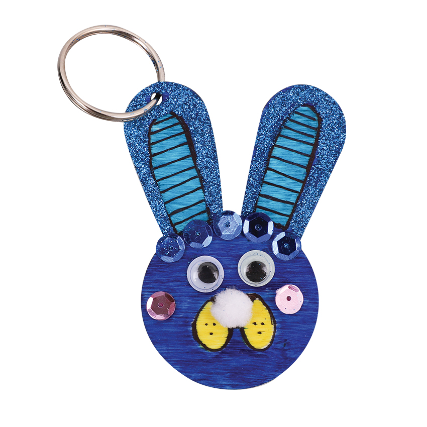 • Step 1Collage Bunny Keyring: There are many different collage materials that can be used to bring your wooden bunny shape to life. We started by colouring the shape using permanent markers and adding in some details such as the ears and nose with a permanent pen. We have glued sequins on as a headband and rosy cheeks, plus a pom pom nose. Wiggle eyes were glued on to complete the face then we added a touch of sparkle with glue and glitter on the ears. Allow to dry completely before adding a split ring through the hole provided. Your Collage Bunny Keyring is now ready to use or gift!