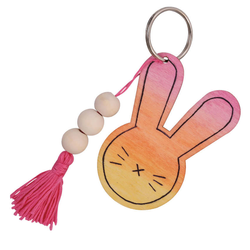 • Step 2Watercolour Bunny Keyring: Choose two or more watercolours that are going to blend into a nice gradient. We have chosen pink, orange and yellow, but you may wish to choose your own colours and even do some experimenting on scrap paper first. When you are happy with your chosen colours, paint the wooden bunny shape and allow to dry. Use a permanent pen to add in any details you wish. We’ve kept it simple and added a basic outline and stylised face. You might want to add an all over pattern or a complete bunny face – it’s up to you! Choose a colour of embroidery thread that goes with your design and make a tassel. You can view our guide on How to Make a Tassel here! Thread both ends of the tassel hanger through some wooden beads. Push one loose end of the tassel hanger through the hole in the wooden bunny shape and then tie both ends together. Add a split ring through the hole. Your Watercolour Bunny Keyring is now ready to use or gift!
