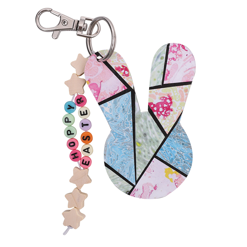 • Step 3Decoupage Bunny Keyring: Begin by colouring your wooden bunny shape black using a permanent marker. Arrange pieces of marbled paper over the top of the bunny shape until you are happy with your design. You can cut pieces down to a smaller size but don’t worry if there’s paper hanging over the edge at this stage. Glue the pieces down in place and allow to dry. Trim any overhanging paper. Adult supervision is recommended when using scissors. Thread a split ring with snap hook onto the bunny shape through the hole provided. Cut 30cm of elastic and fold in half. Attach to the split ring using a cow hitch knot, positioning it behind the bunny shape so it doesn’t cover your design. Thread star beads and alphabet pony beads onto the loose ends of the elastic to form a pattern and/or message. When you are happy with your design, tie the ends of the elastic in a knot to hold the beads in place. Trim any excess elastic. Your Decoupage Bunny Keyring is now ready to use or gift!