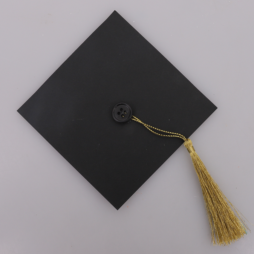 • Step 2Cut a 10cm square from black cover paper and use glue to attach a tassel and black button to the middle to create a mini graduation cap. Adult supervision is recommended when using scissors. Allow to dry.
