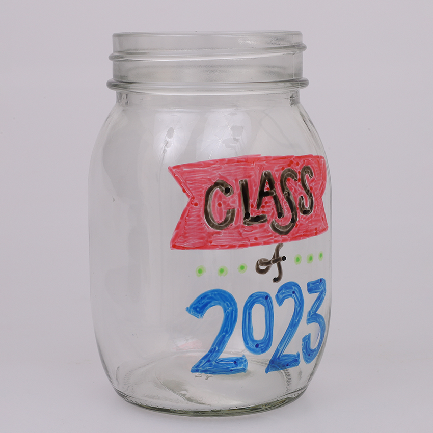 • Step 4Use Glass & Porcelain Markers to decorate your mason jar. You could write the year of your graduation like we have or come up with your own design. Once you’re happy with your design, follow the instructions on the packaging to bake your design for permanency.