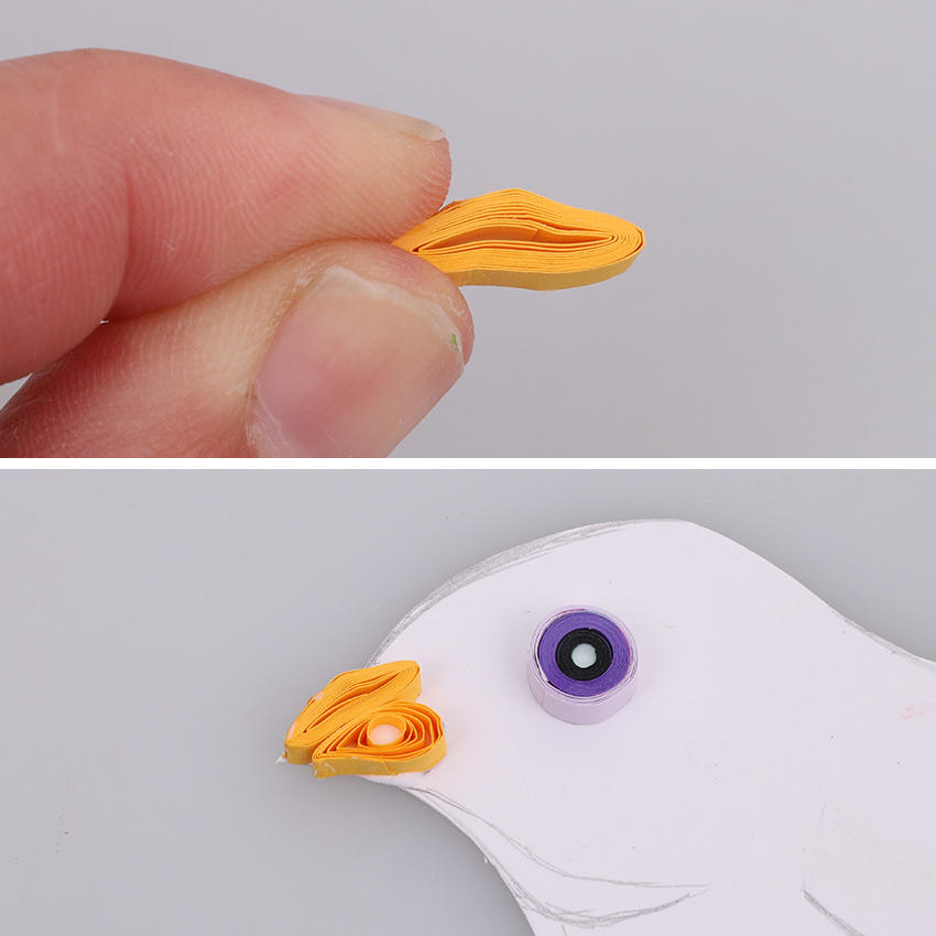 • Step 3Take a dark yellow strip of paper and wrap it tightly around the skewer. Remove the skewer and allow the coil to unravel slightly and become a larger circle. Use a small amount of tacky glue to secure the end of the coil in place. Pinch the coil in your fingers and shape into a piece that will fit the top of the birds’ beak. Create the bottom of the beak in the same way with another strip of dark yellow paper. Once happy with the shapes, glue both in place and allow to dry.