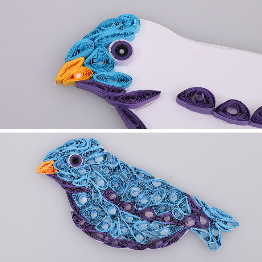 • Step 6Fill the remaining space on the bird shape with blue paper shapes. Use the quilling board to make any shapes you like and once happy with the design, glue it down in place and allow to dry.