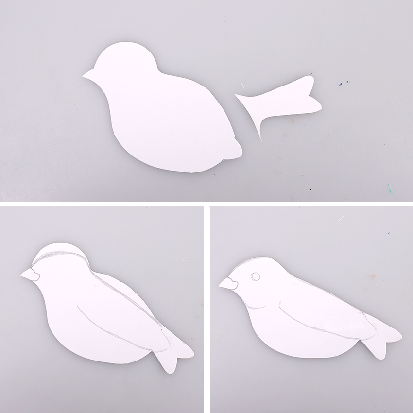• Step 1Use scissors to cut the tail off the bird then glue it behind the body so it is facing downwards as shown. Adult supervision is recommended when using scissors. Allow to dry. Use a pencil to draw in any of the bird’s features or shadow lines you wish to highlight. You may also wish to trim off sections of the bird depending on the type of bird you would like to make.