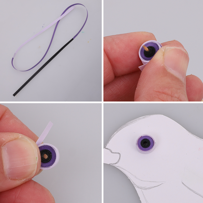 • Step 2Cut a strip of black and a strip of light purple quilling paper in half. Glue these halves to either end of a strip of purple quilling paper to create one long strip. Allow to dry. Starting with the black end, tightly wrap the strip around the pointy end of a skewer. Keep wrapping until you reach the other end. Use a small amount of tacky glue to secure the quilling paper as a coil. Remove the skewer and glue in place on the cardboard bird to create the eye. Allow to dry.