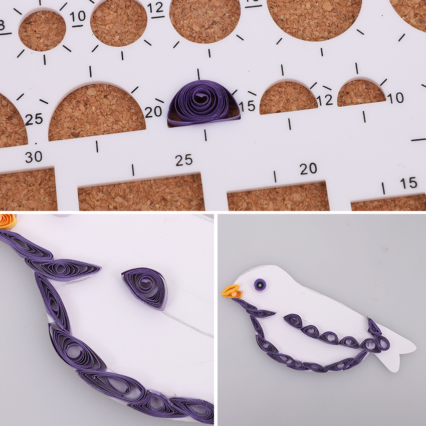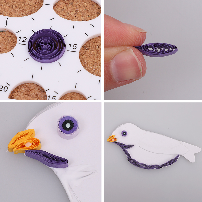 • Step 4Take a purple strip of paper and wrap it tightly around the skewer. Remove the skewer, this time placing it in a circle shape on the quilling board. Allow the paper to uncoil into the shape before gently removing from the board and using a small amount of tacky glue to secure the end of the coil in place. Pinch the coil in your fingers to flatten out. Make more of these shapes in the same way to create the shadow line under the birds’ belly. Once happy with the positioning of the pieces, glue in place and allow to dry.