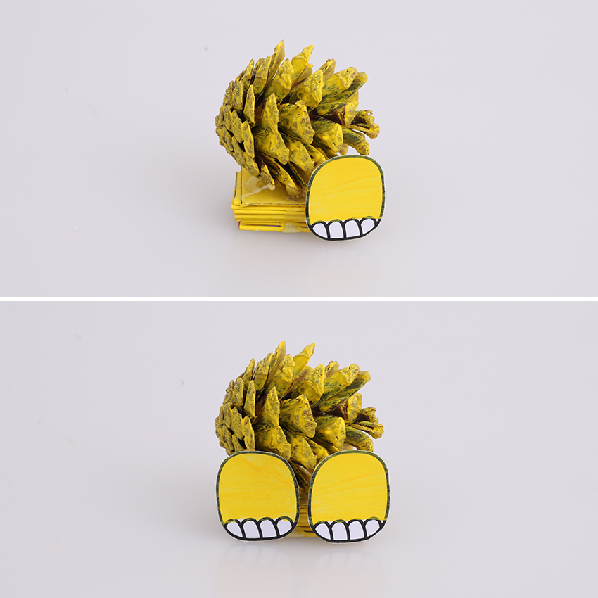 • Step 6Glue two legs to the front of the folded stand and the pine cone tips as shown. Repeat for the other two legs on the opposite side.