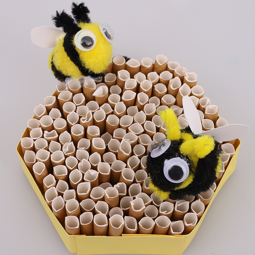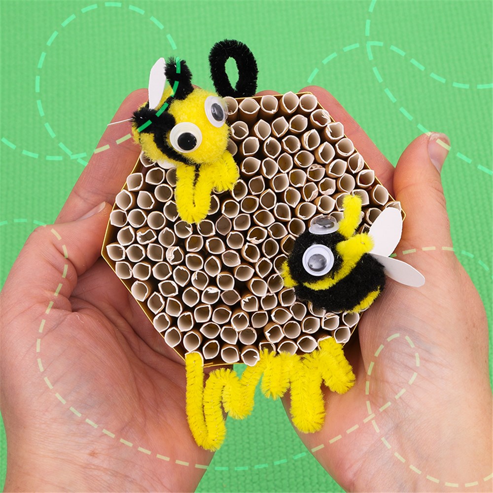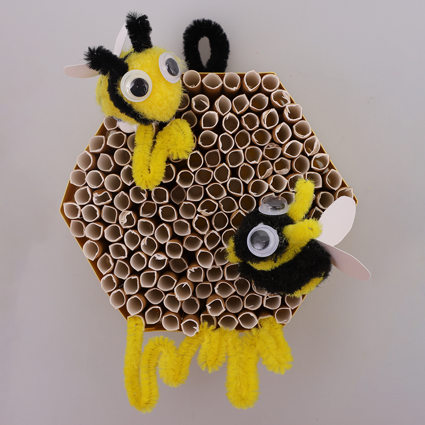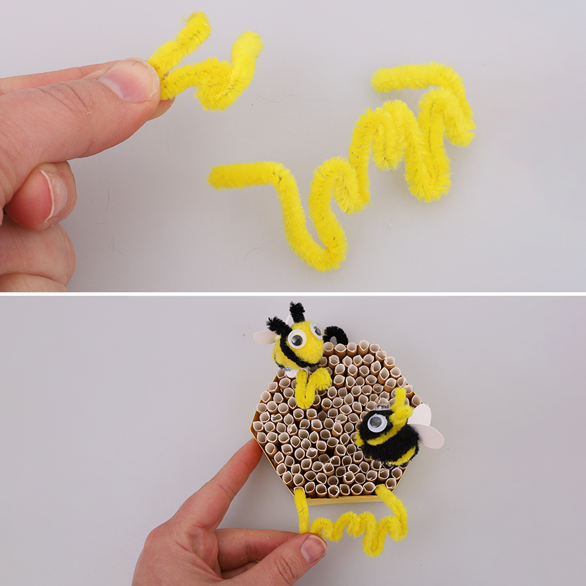 • Step 8Finish your design by cutting some different lengths of yellow chenille stem. Bend them to look like dripping honey, ensuring you leave a short length at both ends. Bend the ends at a 90-degree angle so you can slide them into the straws of the honeycomb to hold in place.