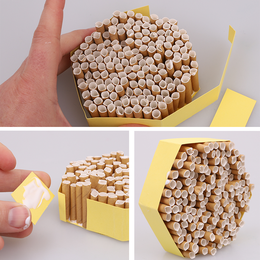 • Step 4Cut a 2.5cm wide strip from the long length of a sheet of yellow cardboard. Cut another 2.5cm wide strip but this time shorter, approximately 4.5cm long. Wrap the longer strip around the outside of the straws, creasing the cardboard at the corners of the hexagon. Wrap it as far around the edge as you can. Once it has been creased and fits to the hexagon, take it off, add glue to the inside of the strip and then wrap it back around in place. Glue the shorter strip to join the loose ends of the longer strip and then allow to dry. Your honeycomb is now ready for a bee!